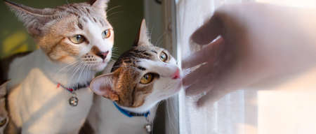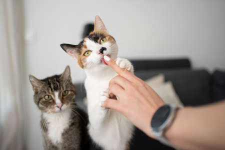 two different looking cats side by side. One cat is licking finger of female pet owner