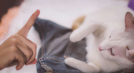 Soft focus Girl playing with cat to Comfort a Sick Cat. Happy kitten