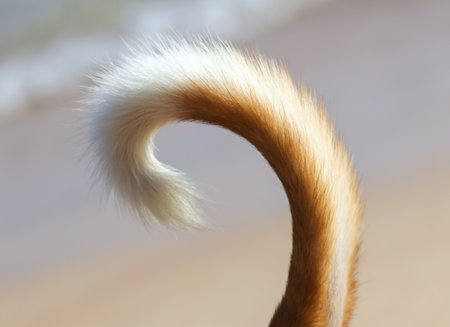 A dog's tail is curled up and has a white tip. The tail is brown and white, and it is on a sandy beach