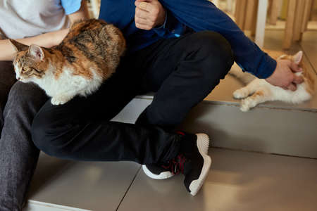 A group of cats in a cat cafe. Charity space.