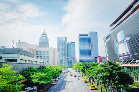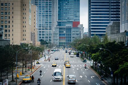 Taipei, Taiwan - May 16, 2019: Fabulous view of Xinyi Road on sunny day. Day traffic of Taipei. Scenic cityscape. Taiwan is a popular tourist destination of Asia.