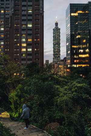 Taipei 101 Skyscraper at dusk with commercial buildings and man wearing hood jacket in foreground from Xiangshan Elephant Mountain in the evening in Taipei, Taiwan.