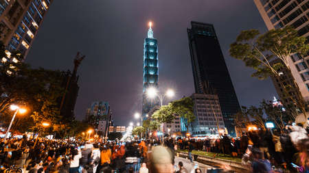 TAPEI, TAIWAN. DEC 31, 2011: Taipei City Night landscape and Taipei 101 skyscraper before lit up by fireworks. People watching and taking photos and videos around buildings to celebrate the new year.