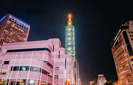City skyline in night with famous 101 skyscraper and buildings in Taipei, Taiwan.