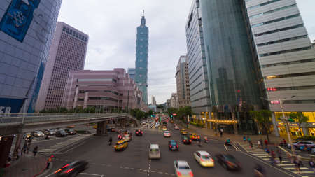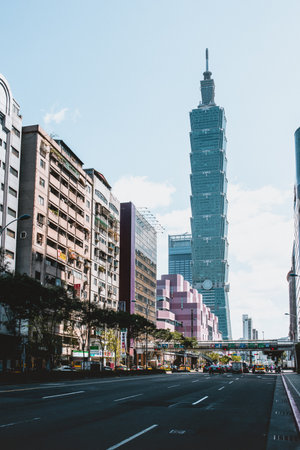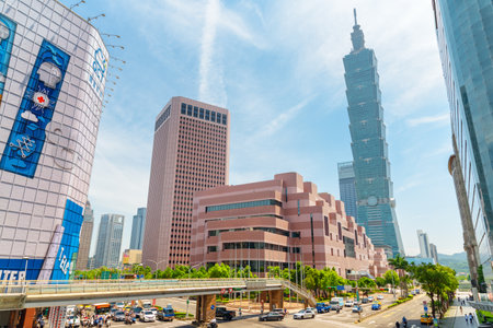 Taipei, Taiwan - April 25, 2019: Fabulous view of intersection of Xinyi Road and Keelung Road on sunny day. Taipei 101 (Taipei World Financial Center) is visible at right. Scenic cityscape.