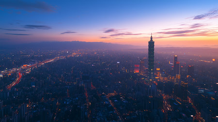 Aerial view of Taipei skyline at dusk featuring Taipei 101 illuminated among city lights