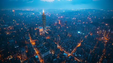 Asia Business concept for real estate and corporate construction - panoramic modern city skyline bird eye aerial view under night blue bright sky in Taipei, Taiwan