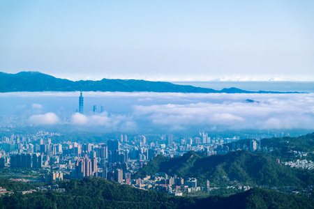 As dawn breaks, white clouds waltz gracefully over Taipei's skyline. Captured from Lion's Head Mountain, this scene evokes a sense of tranquility and harmony with nature.