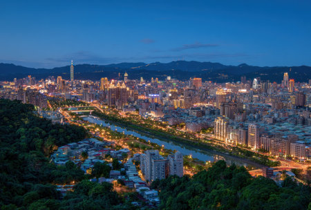Night scenery of Taipei City, with Taipei 101 Tower among high-rise buildings in XinYi Commercial District, residential blocks in suburbs & city lights in downtown area glistening in evening twilight