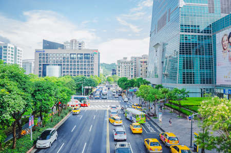 Taipei, Taiwan - May 16, 2019: Fabulous view of Xinyi Road on sunny day. Day traffic of Taipei. Scenic cityscape. Taiwan is a popular tourist destination of Asia.
