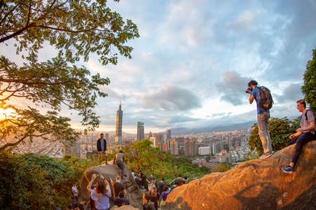 Tourists take photos of Taipei 101 and the city during a sunset on top of the giant rocks of Elephant Mountain in Taipei, Taiwan.