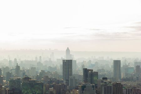 View of buildings and skyscraper in the city covered by smog