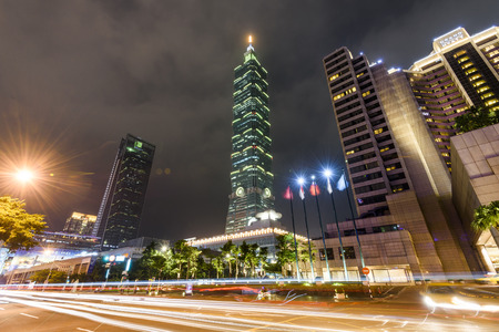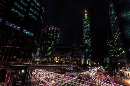 Taipei main road at night with the famous building 101 and traffic car light long exposure photo shooting technique. Cityscape of street with traffic and pedestrians in the capital city of Taiwan.