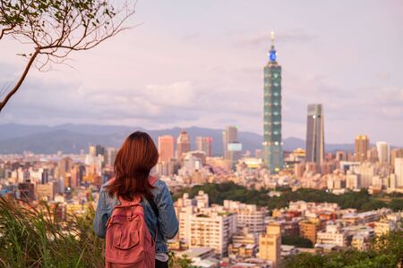 Young woman traveler looking beautiful cityscape at sunset in Taipei, Travel lifestyle concept