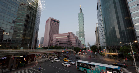 Taipei, Taiwan - April 25, 2019: Fabulous view of intersection of Xinyi Road and Keelung Road on sunny day. Taipei 101 (Taipei World Financial Center) is visible at right. Scenic cityscape.