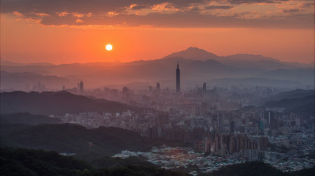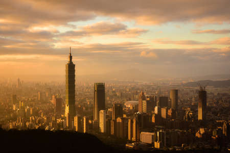 Skyline view of Taipei glowing in the sunset light