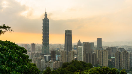 Sunset aerial view of the Taipei 101 and cityscape from Xiangshan at Taipei, Taiwan