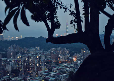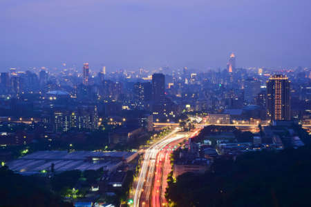 Cityscape nightlife view of Taipei. Taiwan city skyline at twilight time, public scene from view point at Elephant Mountain Hiking Trail in purple tone