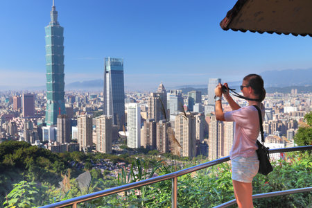 Panoramic view of Taipei 101 Skyscraper and other modern buildings from the top of the Xiangshan mountain in Taipei, Taiwan.