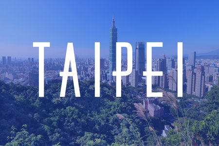 Taipei, Taiwan. City name modern photo postcard. Travel destination text word title card.