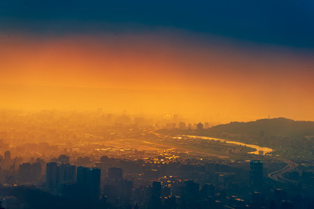 A panoramic view of Taipei City after the rain, with the Keelung River winding through the urban landscape. The setting sun casts a warm glow over the cityscape. Taipei, Taiwan.