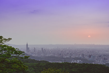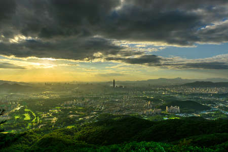 Sunset aerial view of the Taipei 101 and cityscape from Xiangshan at Taipei, Taiwan