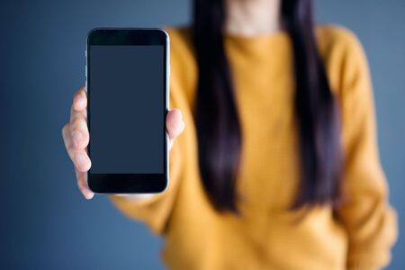 Smart Phone Mockup image with Long Black Hair Female Model holding and showing a mobile with blank screen