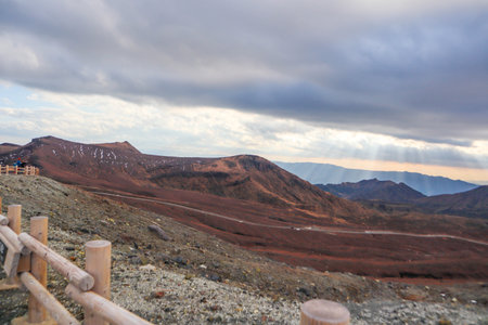 Mount Aso Nakadake volcano crater, Aso-San, caldera, Aso-Kuju National Park hiking, Kyushu island region, Kumamoto prefecture, Japan, eruption with steam and smoke, volcanic desert landscape view