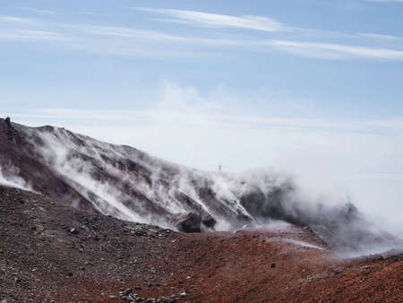 Silhouette of man hiking at coldera of Avachinsky stratovolcano, also known as Avacha Volcano. Backpacker tourist moves upon rocks behind steam from hot geysers. Kamchatka Peninsula, Russia.