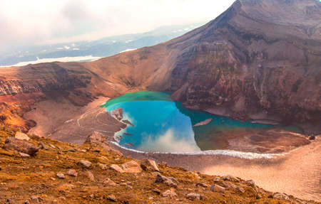Green lake in the mouth of Gorely volcano in Kamchatka
