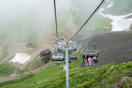 Krasnaya Polyana. Russia. July 28, 2019: Tourists climbing to the mountain peaks through the clouds in the open cabins of the cable car. Mountain tourist resort of Russia in the vicinity of the city of Sochi.