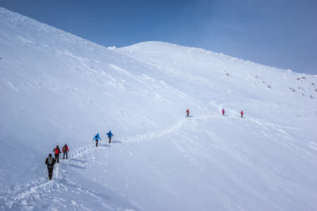 Ciucas mountains in winter, Romanian Carpathians. Fir trees and junipers full of frozen snow. There are hikers in the image.