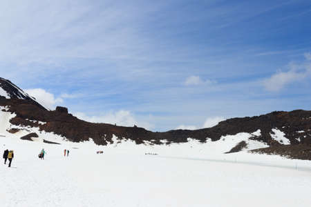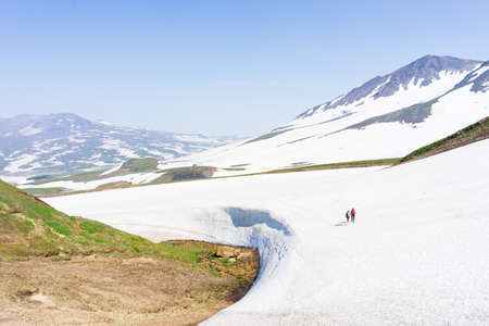 Hiking trails through glaciers, volcanoes and mountains of Kamchatka, snow-capped peaks, tourists