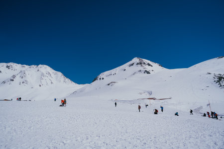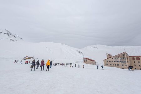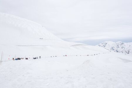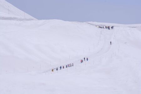Tateyama, Japan - April 21, 2019 : Unidentified people visiting Murodo snow field on Tateyama Kurobe Alpine Route, Japanese Alp in Tateyama, Japan.