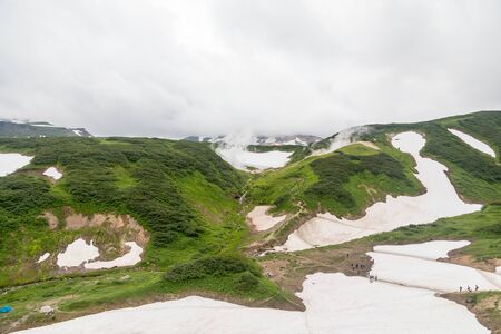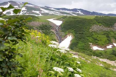 View of volcanoes with snow and hills with green grass in Kamchatka, Russia. Beautiful summer landscape