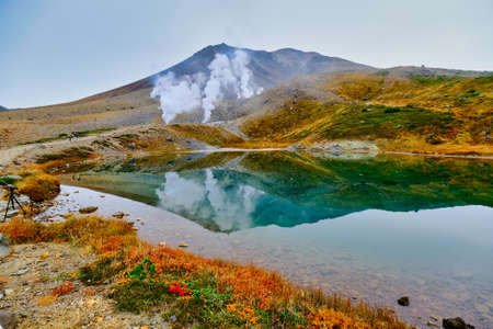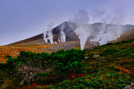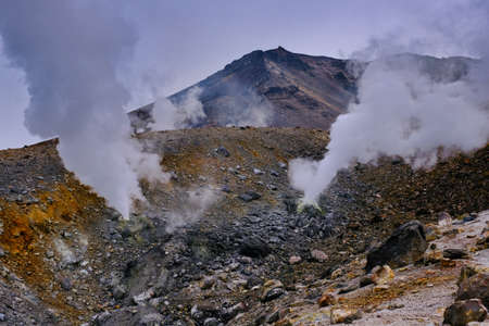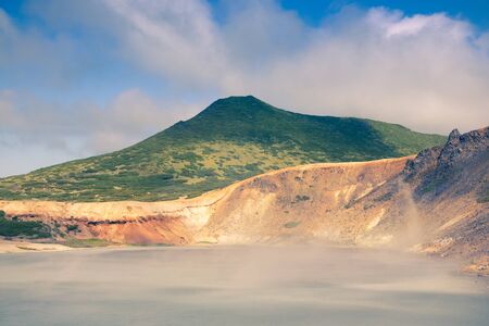 Noboribetsu Jigokudani (Hell Valley): The volcano valley with sulfuric smell, extremely high heat and steam spouting out of the ground in Hokkaido, Japan.