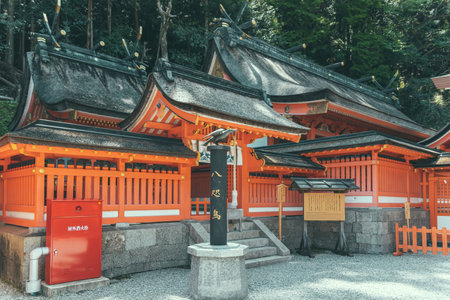 Matsuyama, Japan - May 22, 2025 The Main Hall Honden of Isaniwa Jinja, a Shinto shrine in Matsuyama city. High quality photo