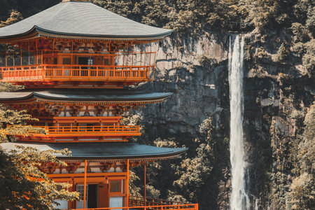 The red three-story pagoda of Seigantoji Buddhist Temple in front of Nachi Falls. Beautiful natural scenery in Nachikatsuura, Japan