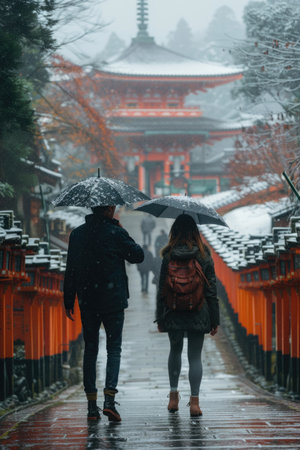 A Torii Gate Illuminates a Rainy Path, Ancient Sanctuary Beckons through Nature s Embrace.
