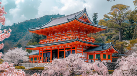 A vibrant traditional temple stands majestically amidst blooming cherry blossoms in spring, showing nature's beauty.