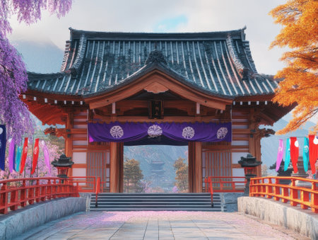 An ultra-realistic digital painting of a beautiful, traditional Japanese temple gate with intricate details, surrounded by vibrant autumn foliage and a stone path. High quality photo