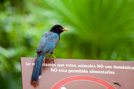 Yucatan jay bird birds in the tree top trees crown on a branch in tropical jungle forest nature in Playa del Carmen Quintana Roo Mexico.