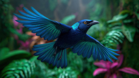 A striking blue bird gracefully glides through a lush tropical rainforest, showcasing its brilliant plumage against vibrant green foliage, embodying the beauty of nature.