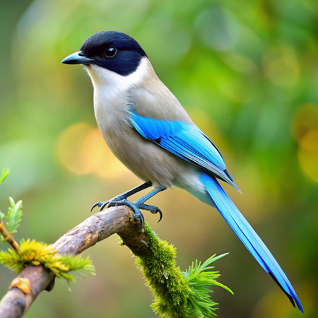 A vibrant bird boasts its striking blue and white plumage in soft light.