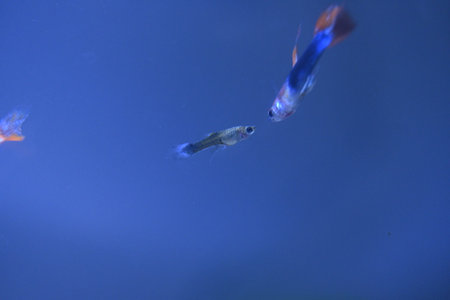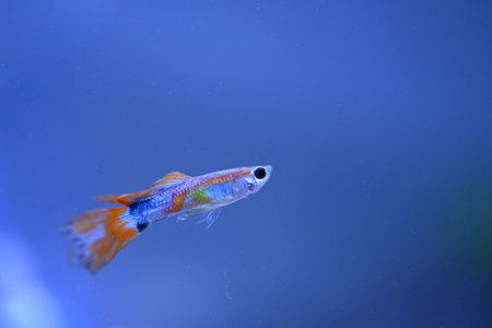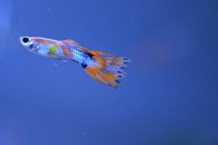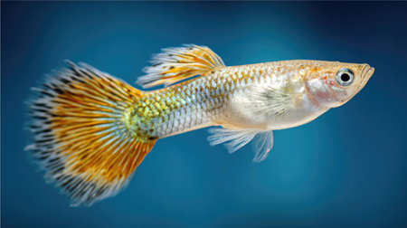 A close-up shot showcases a colorful guppy fish, its yellow tail fin contrasting against a blue background. The image highlights the fish's intricate scales and fins, demonstrating a clear focus on the aquatic subject. Ideal for various commercial applications, it could be used for educational materials or decorative designs.