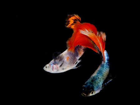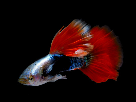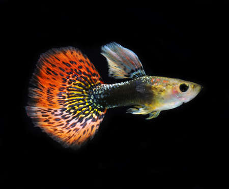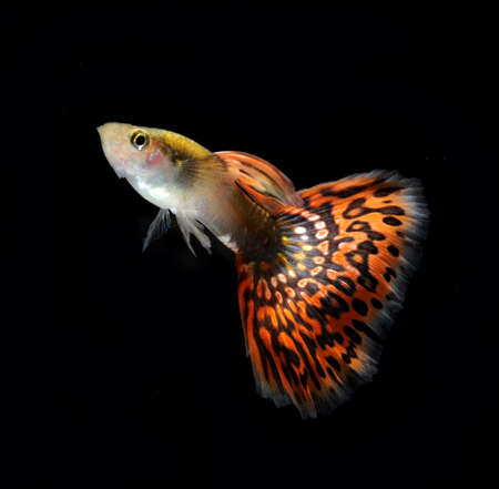Fish. Beautiful Guppy glides gracefully, its shimmering colors like strokes of living light. Each delicate fin flows like silk in water. Guppy isolated on black.