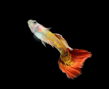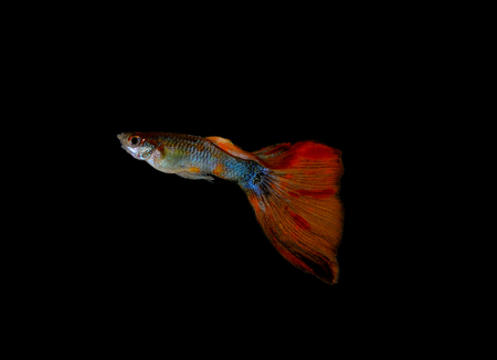 Fish in aquarium. Red Guppy glides gracefully, its shimmering colors like strokes of living light. Each delicate fin flows like silk in water. Guppy isolated on black background.