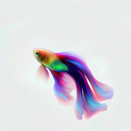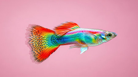 A single guppy fish is shown in profile against a smooth, graduated blue backdrop. The fish exhibits a pearlescent body with iridescent scales and colorful fins. Warm hues of orange and yellow contrast with the cool blue. The image is suitable for various commercial uses and presentations.