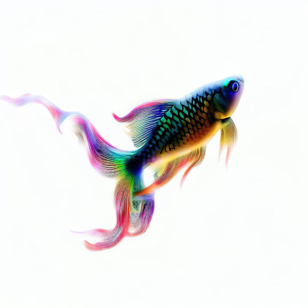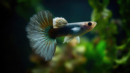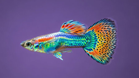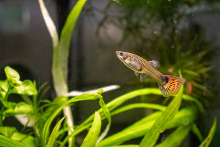 A close-up view displays a guppy fish exhibiting vibrant colors and intricate details of its scales and fins. The composition is set against a blurred background of aquatic plants. This image may be suitable for educational materials, scientific publications, or decorative purposes. The lighting appears soft, highlighting the textures.