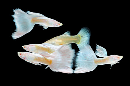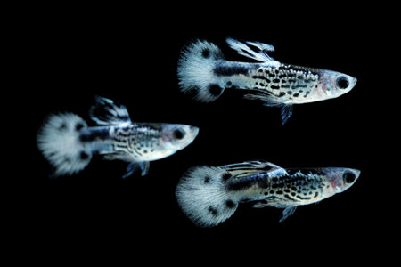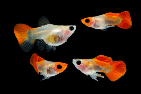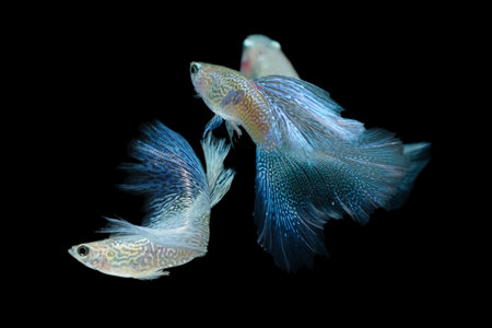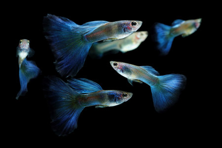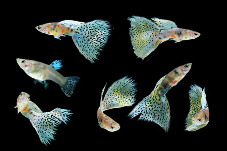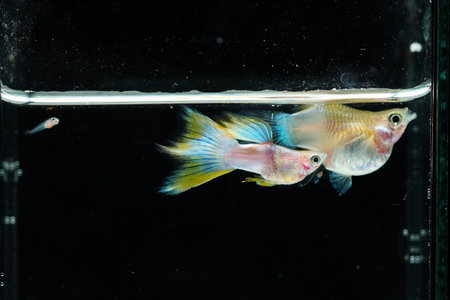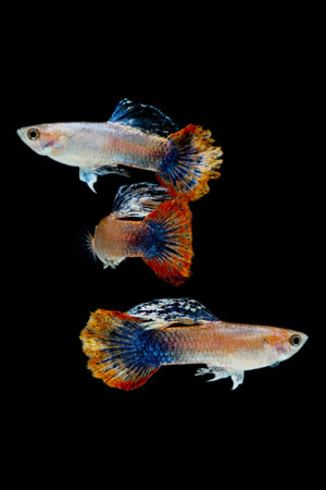 Fish in aquarium. Pingu Guppy Short Body glides gracefully, its shimmering colors like strokes of living light. Each delicate fin flows like silk in water. Guppy isolated on black